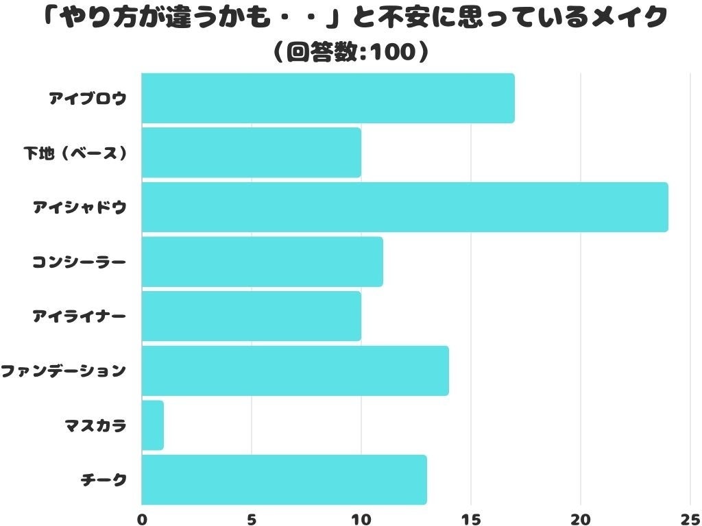 「やり方が違うかも・・」と不安に思っているメイクをアンケートにて調査したところ、1位は「アイシャドウ」でした。