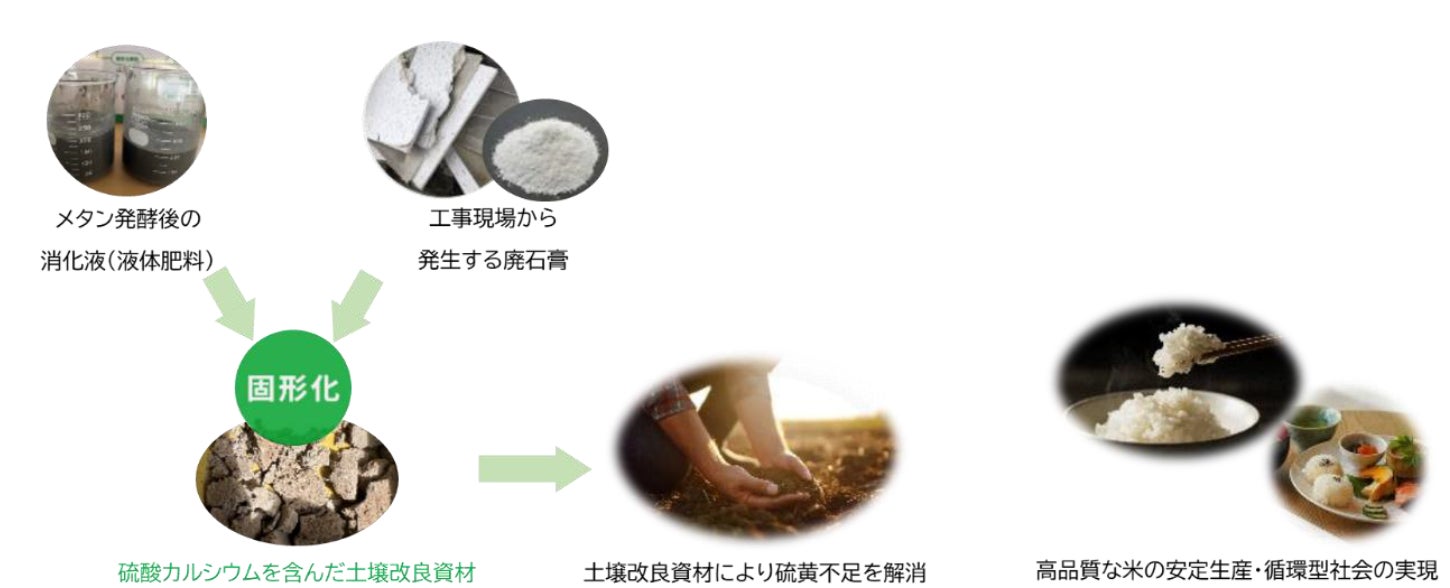昨今の猛暑による高品質米(一等米)の収穫量の減少の原因である水稲の硫黄欠乏は、硫酸カルシウムに含まれる硫黄分によって予防できるという研究成果があるため、廃石膏を活用した土壌改良資材の導入は稲作農家の課題解決につながると考えています。まずは大阪府の稲作農家に導入し、更なる展開も予定しています。