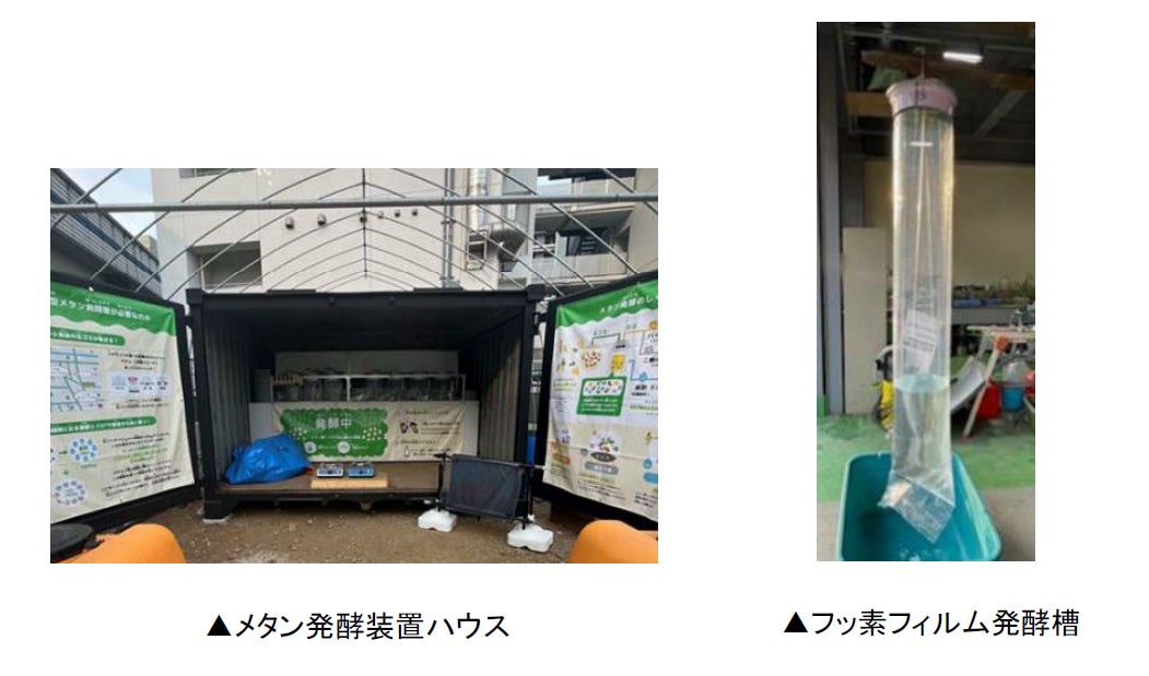 世界で初めてリサイクルフッ素フィルムを採用したメタン発酵装置を用い、ドトールコーヒー駒沢大学店で発生する抽出後のコーヒー粉(コーヒーグラウンズ)などをメタン発酵装置により、メタンガス(バイオガス)と消化液に分解します。消化液は液体肥料としてファームの野菜栽培に活用しました。