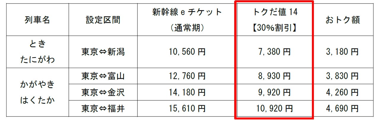 えきねっと会員限定のおトクなきっぷを上越新幹線および北陸新幹線にもご用意しております!お早めにご予約いただくことで運賃と料金が割引になる「新幹線eチケット(トクだ値14)」でおトクにご旅行ください。