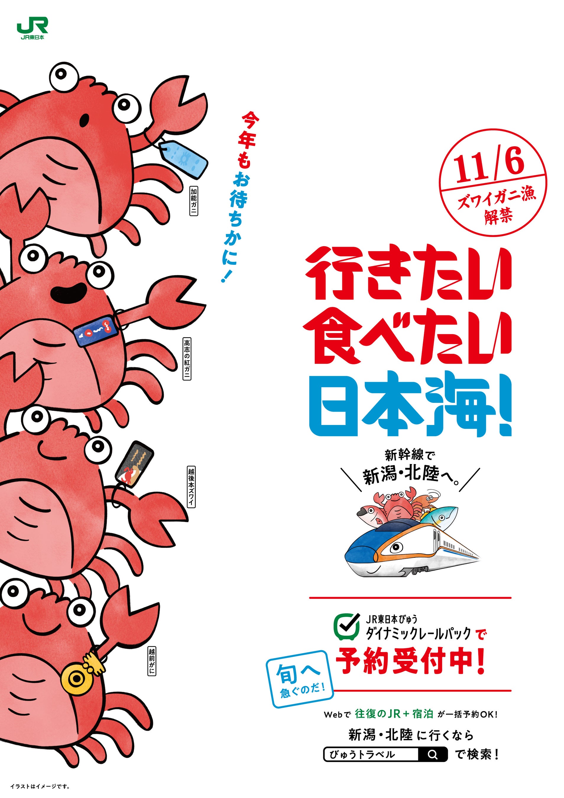 ○JR東日本では、2017年度より実施してきた「かにを食べに北陸へ。」キャンペーンをリニューアルし、新潟エリアを加えた新たなプロモーションを展開します。 ○新潟・北陸エリアの日本海で獲れる海の幸をテーマとして、現地に足を運び、味わっていただく旅を提案します。また、旅行会社と連携して魅力的なプランを造成していきます。 |