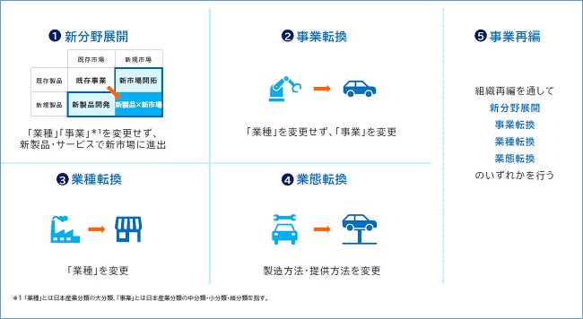 「事業再構築」とは経営環境の急激な変化に対応することを目的に、次に掲げるいずれかの類型に該当するものをいいます。