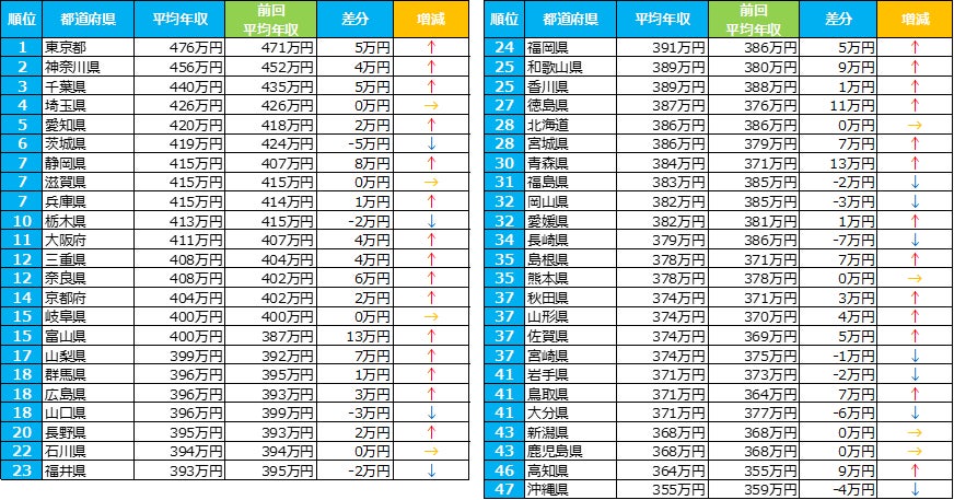 都道府県別:47都道府県のうち28都府県で年収アップ。トップ4を関東の都県が占める