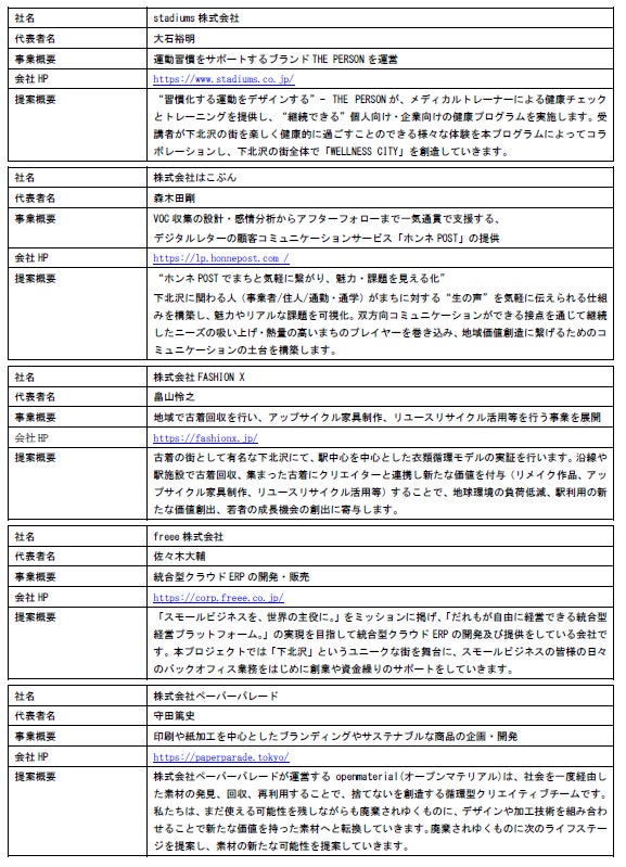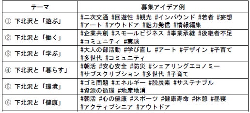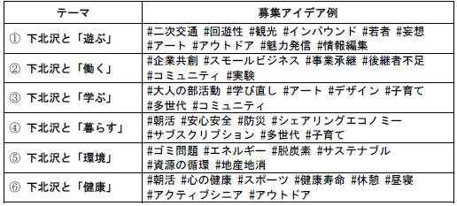 本プログラムの第一弾は多様な文化が交わり、絶えず自由に変わり続ける下北沢を舞台に、「遊ぶ」「働く」「学ぶ」「暮らす」「環境」「健康」の6つのテーマを設定し、10月から外部企業による提案を募集しました。