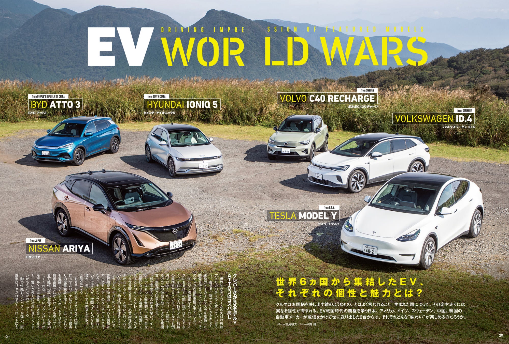 日本(日産アリア)、韓国(ヒョンデ アイオニック5)、中国(BYD ATTO 3)、アメリカ(テスラ モデルY)、ドイツ(フォルクスワーゲンID.4)、スウェーデン(ボルボXC40リチャージ)が集結! どんな人がどのEVに向いているか、レポートしています。