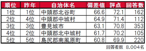 中頭郡に属する北谷町・中城村・北中城村や、島尻郡に属する南風原町など、トップ5のうち4自治体が、郡部の「町」や「村」です。