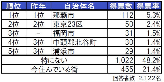 那覇市が、5.3%の高い得票率で4年連続で1位に輝きました。2位は2年連続で東京23区、3位は初ランクインの福岡市です。4位は「住みここち」1位の中頭郡北谷町、5位は浦添市となっています。