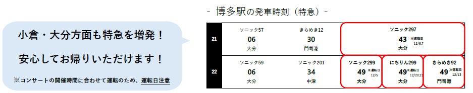 JR九州では、12月に「みずほPayPayドーム福岡」で開催されるコンサートのお帰りの時間に合わせて、臨時列車を運転します。コンサート後も安心してお帰りいただけますので、お出かけにはぜひJRをご利用ください。