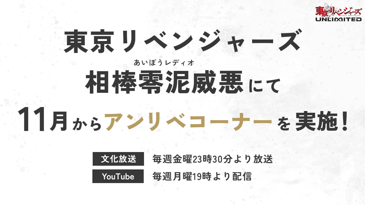 新祐樹氏と狩野翔氏がパーソナリティを務めるラジオ番組、『東京リベンジャーズ 相棒零泥威悪(あいぼうレディオ)』にて、11月からアンリベコーナーの実施が決定いたしました。