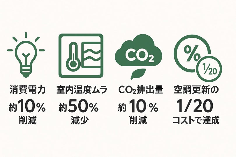 ・従来に比べ約10%の省エネ(節電)及び、約50%の室内温度ムラ削減(室内の温度が一定に保たれる)が達成されました。これにより、CO2排出量についても約10%の削減効果が測定されました。 ・上記について、空調設備を入れ替える場合と比べて約20分の1のコストで達成できることが確認できました。 |