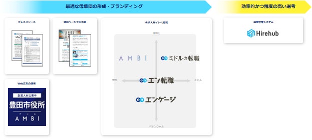 プレスリリースや特設ページ、Web広告での告知に加え、各求人サイトでの集客支援を実施。『エン転職』『エンゲージ』『AMBI』『ミドルの転職』とターゲットの異なる求人サイトを活用することで、ターゲットへ網羅的に求人を届けます。さらに、採用管理システム『Hirehub』の提供により、選考フローを支援。求職者との適切なマッチングを実施します。