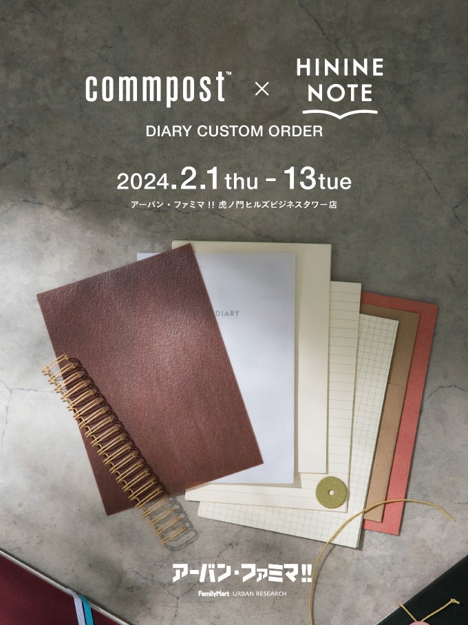 株式会社アーバンリサーチ(本社:大阪府大阪市西区、代表取締役社長 竹村幸造)は、この度、1冊からオリジナルノートが作れる、東京・代々木八幡の「HININE NOTE(ハイナインノート)」全面協力のもと、アーバンリサーチが異業種協働で取り組む廃棄衣料アップサイクルブランド「commpost(コンポスト)」の生地を表紙に活用した、ダイアリーカスタムイベントを開催いたします。(※ダイアリー以外のノートオーダーも可能です。)