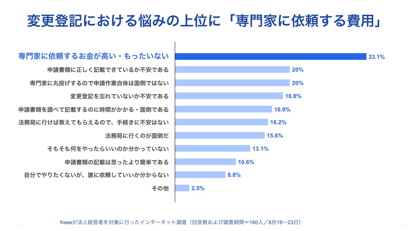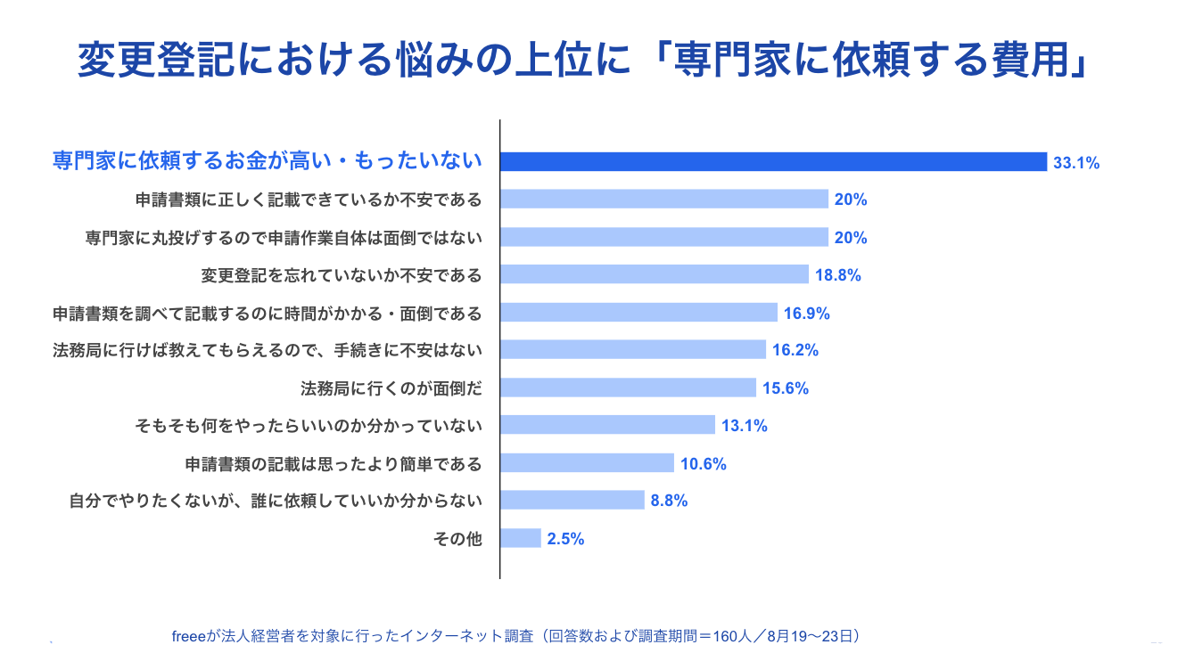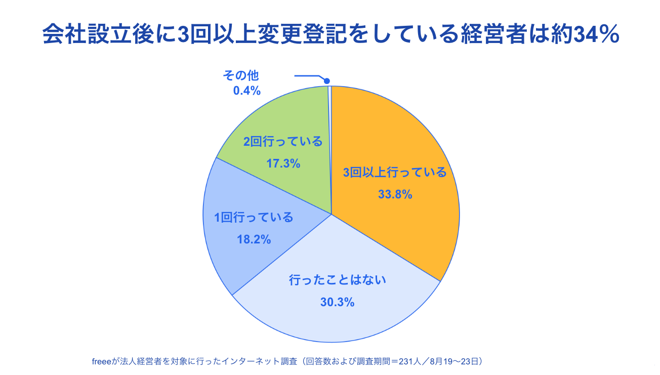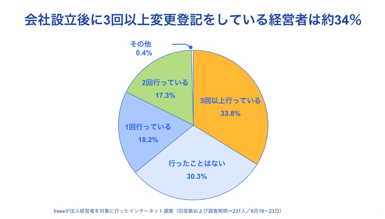freeeが法人経営者を対象に行った調査で、会社設立後3回以上の変更登記を経験している経営者は約34%を占め、約70%の経営者は変更登記を経験しているという結果となりました。また、変更登記を誰が行ったかという問いについては約34%の経営者が「専門家が書類を作成し専門家が法務局に提出した」という結果となりました。さらに変更登記における悩みについては「専門家に依頼する費用が高い」が上位を占めることがわかりました。