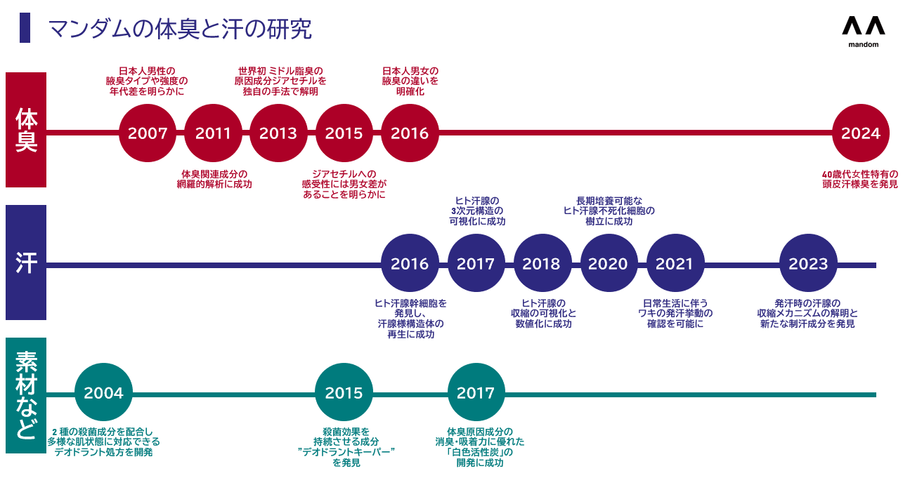 マンダムは「汗」や「におい」を身体的な問題だけでなく、精神的に大きな影響を及ぼすことでQOLに大きく関わる“社会的な問題”と捉え、研究に注力してきました。その研究は、汗やにおいの発生メカニズムの解明やミドル特有の体臭成分の発見、汗腺の根本を眠らせる成分の発見など、幅広い成果につながっています。