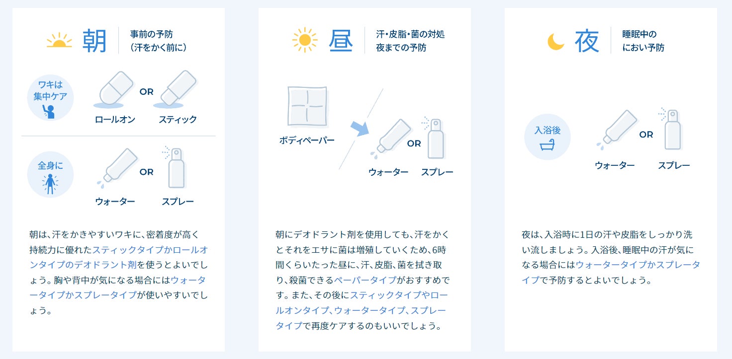 汗のにおい対策には汗を抑え、殺菌ができるデオドラント剤を活用するとよいでしょう。また、デオドラント剤は汗をかいてから使用するという方もいるかもしれませんが、おススメの使用タイミングは「汗をかく前」です。常在細菌が増殖する前にデオドラント剤を使用しましょう。また、「汗臭(ワキ臭)」は主に10代半ばから20代半ばに多く発生しますが、40代以降も汗はかくのでケアは必要です。