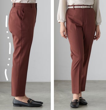 パンツ専門工場ならではの繊細な立体縫製技術とアイロンワーク(プレス)により、脚のラインを拾わずまっすぐに見せてくれるシルエット。はくだけでまっすぐ伸びるきれいな脚を演出できます。