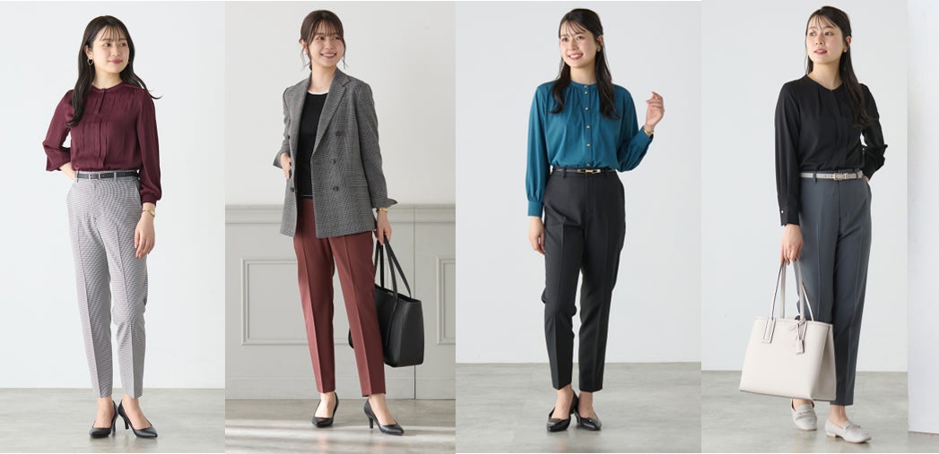 カラー展開は、従来の黒・グリーンに加え、コーディネートのアクセントになる白黒チェック・秋冬にぴったりのレンガが新登場。全4色展開で、オフィスカジュアルスタイルのコーディネートの幅が広がります。