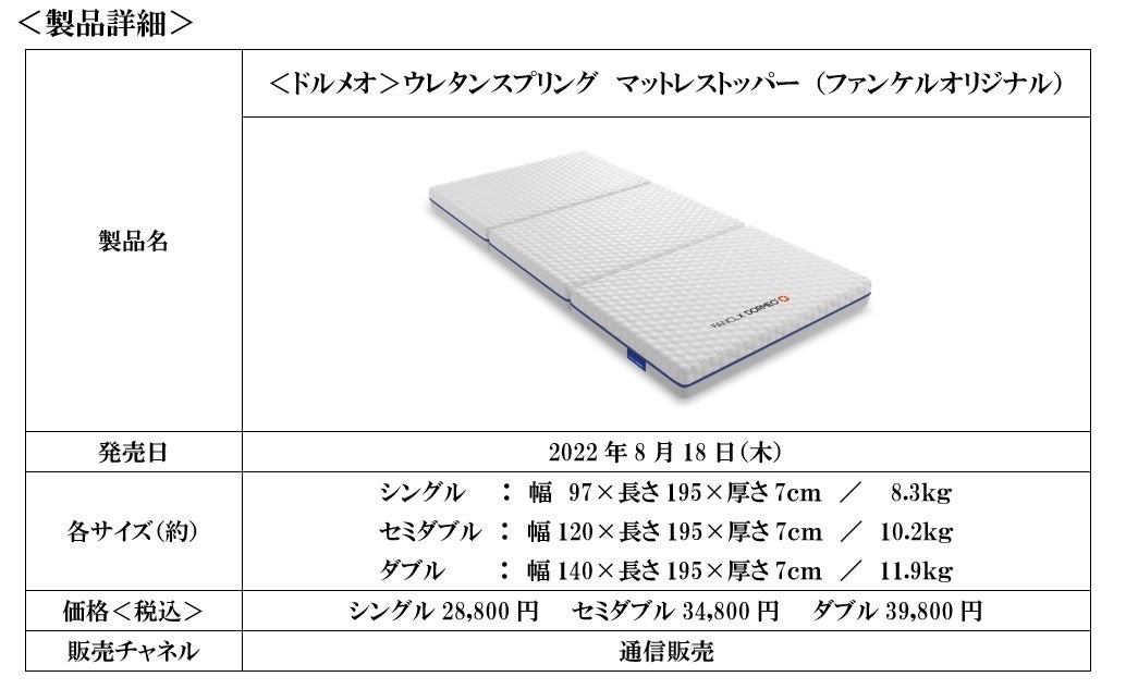 株式会社ファンケルは8月18日(木)から、「<ドルメオ>ウレタンスプリング マットレストッパー (ファンケルオリジナル)(全3タイプ/価格:28,800円~39,800円<税込>)を数量限定で通信販売にて発売します。