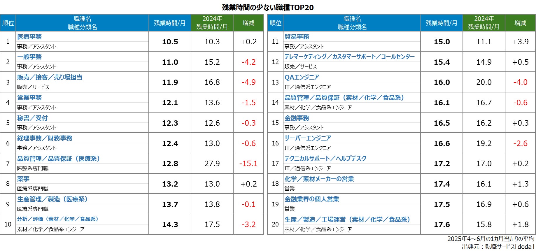 残業時間が少ない職種1位は前回同様「医療事務」、多い職種1位は「総合商社の営業」。20、30、40代は残業時間が減少、50代は増加傾向