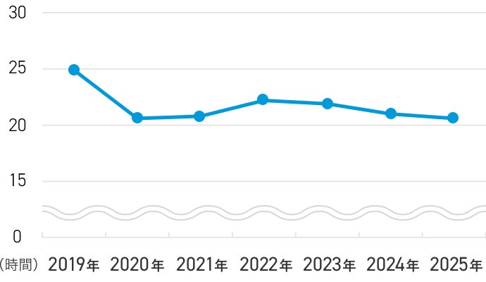 平均残業時間:2025年の平均残業時間は20.6時間/月で、前回2024年の調査より0.4時間減。(3年連続減少傾向)