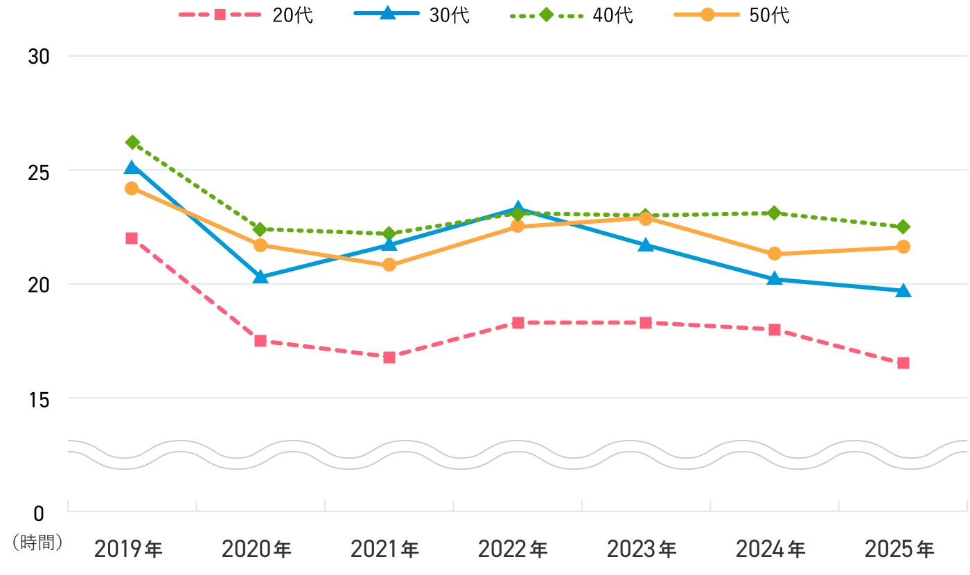 20代が他年代と比べて減っている背景には、ワーク・ライフ・バランスを重視する傾向の強いZ世代など若年層の採用強化のために、残業時間の削減をより意識した人事制度の導入を進める企業の動きなどがあると推測できます。
