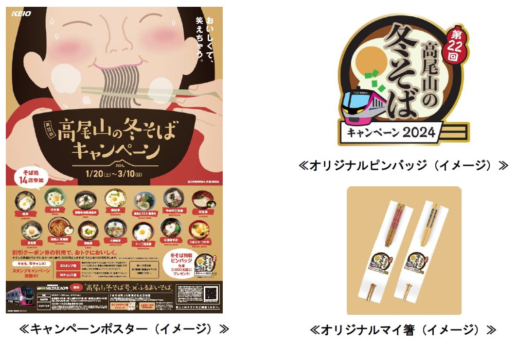 本キャンペーン期間中に、Mt.TAKAO1号(新宿駅 9:00発)を「高尾山冬そば号」として2日間限定で運行します。また、「高尾山冬そば号」にご乗車された方を対象に、オリジナルマイ箸をプレゼントするほか、乗車後配布された試食券を持参し、高尾登山電鉄の清滝駅前に行くと、ふるまいそばを試食することができます。