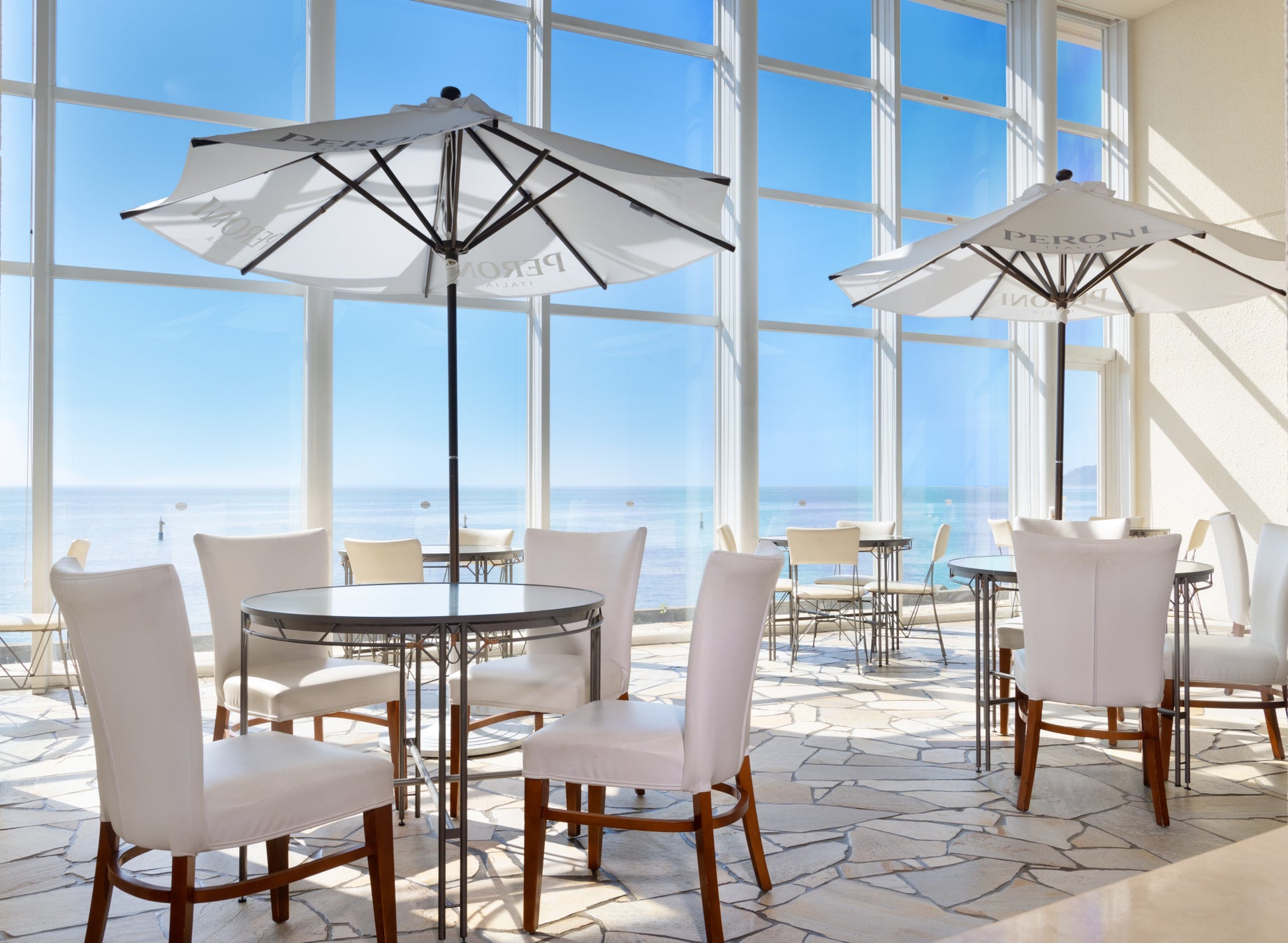 窓一面に広がる煌めく海を眺めながら、ゆったり寛げる絶景カフェ。