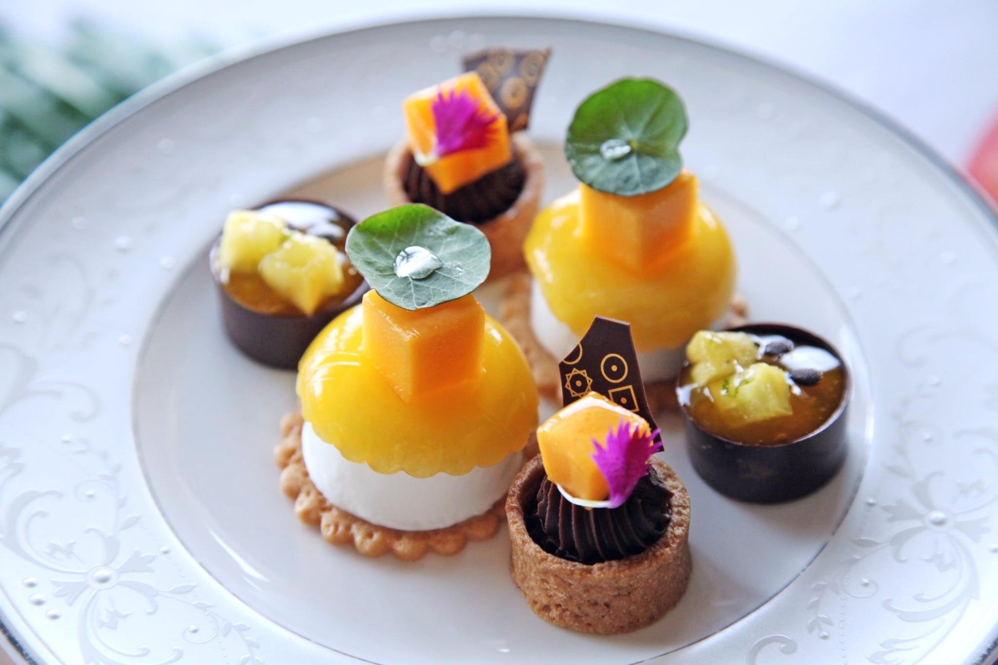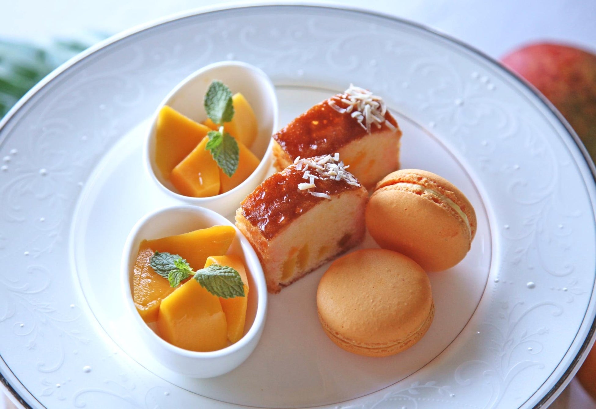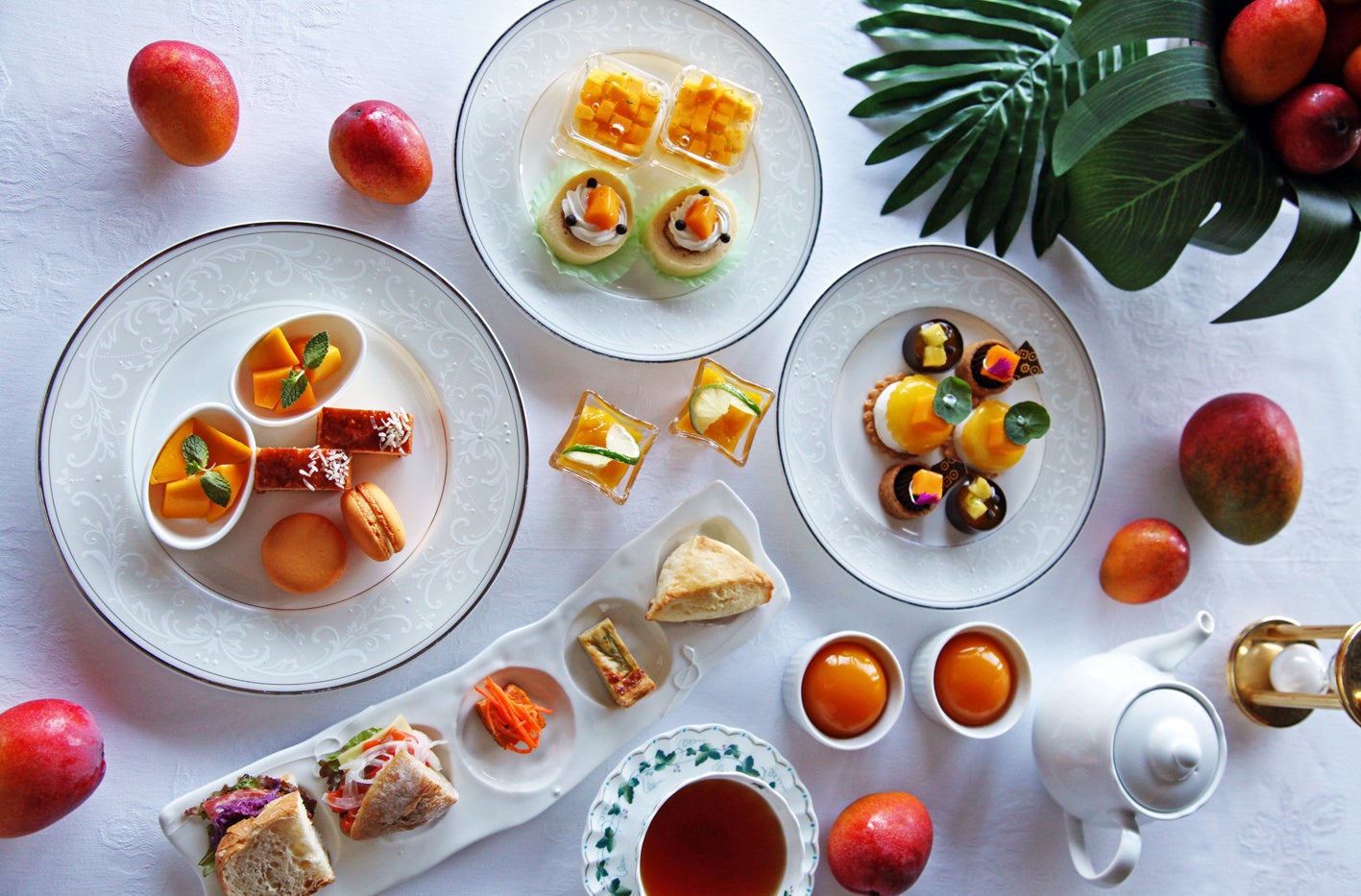 アフタヌーンティーでは、マンゴーロールやマカロン、マンゴーヴェリーヌなど、瑞々しいマンゴーとの絶妙なマリアージュが楽しめる特別なスイーツを。セイボリーには、相性の良いスモークサーモンサンドや野菜のキッシュ、スコーンとマンゴーコンフィチュール、フレッシュマンゴーまでお愉しみいただけます。