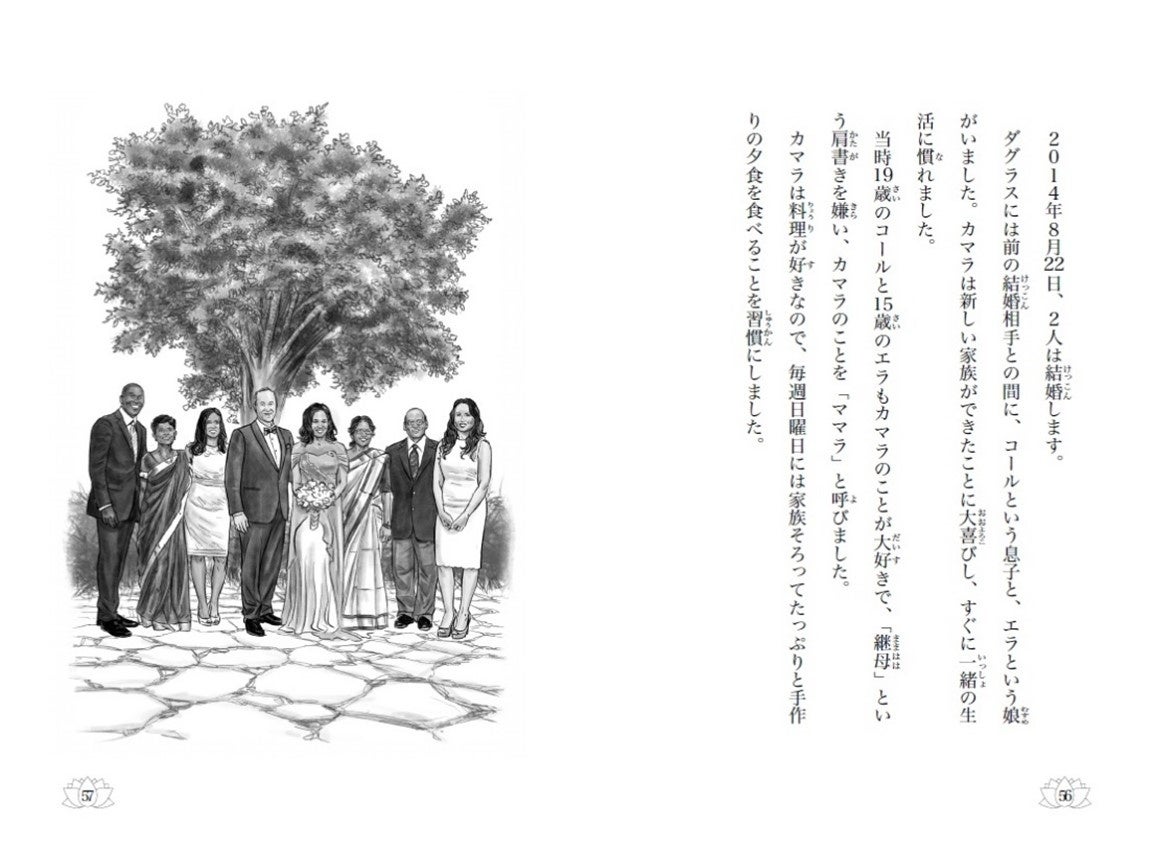 巻頭には、カマラの人生がダイジェストでわかるカラー口絵4ページを収録。さし絵も随所に入っており、小学校4年生以上の漢字にはルビが振ってあります。また巻末には、本文理解の助けとなるよう、カマラの生まれた場所とアメリカ50州の位置がわかる地図、そして「アメリカ議会のしくみ」「アメリカ大統領選挙の流れ」についての解説も掲載しています。