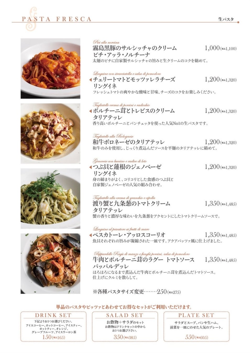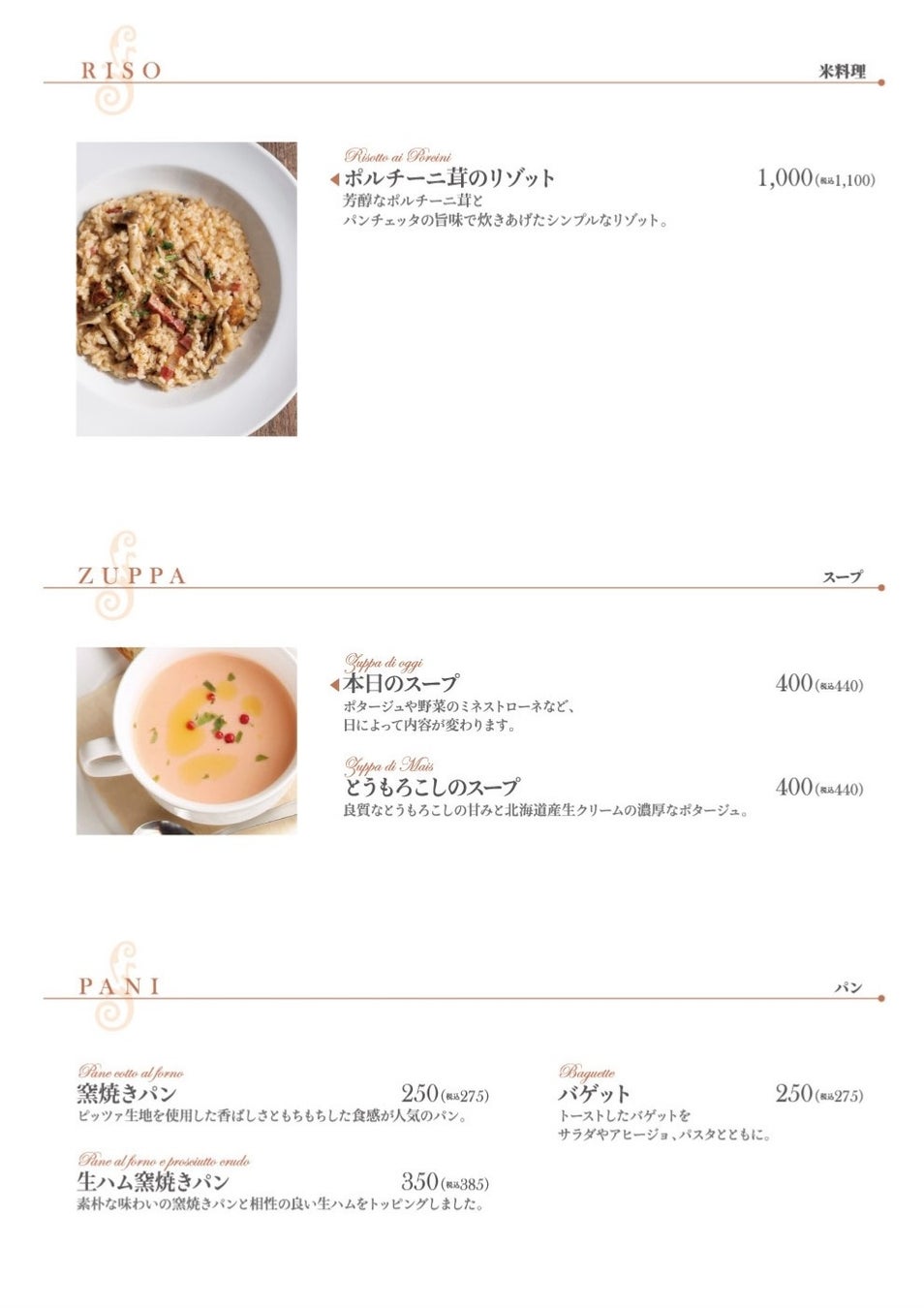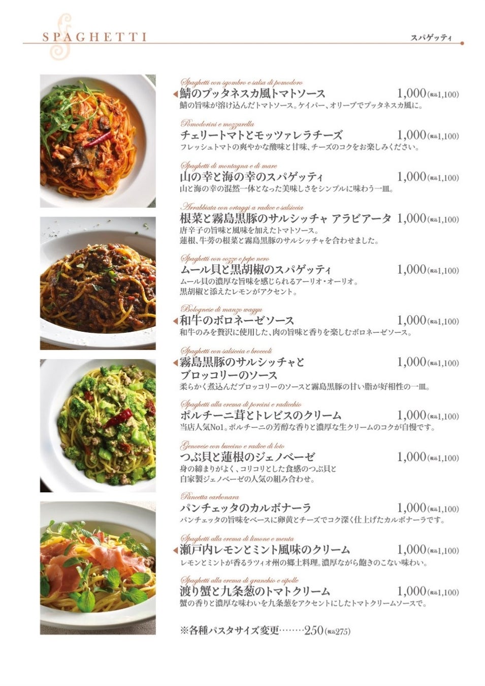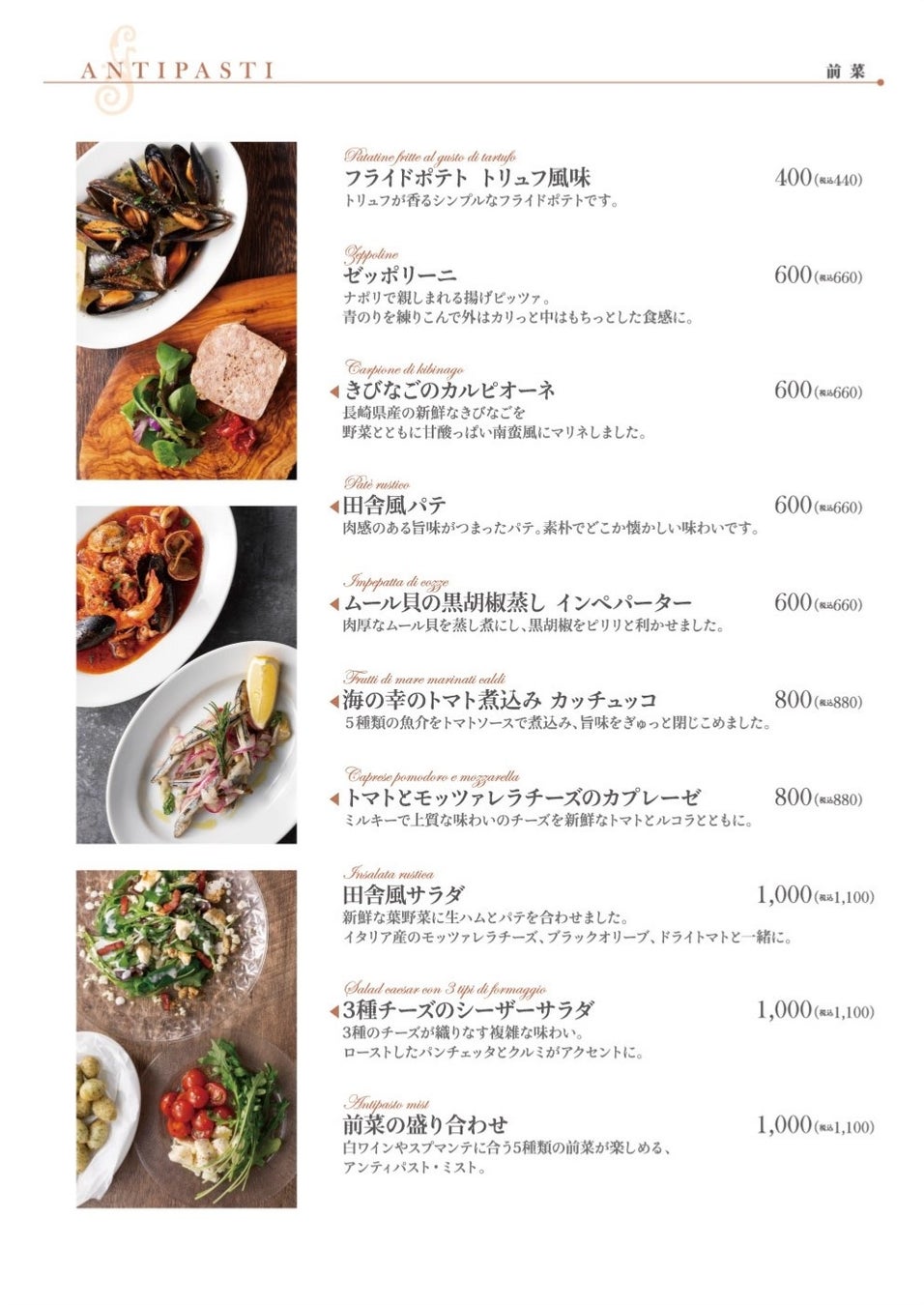 新グランドメニューでは、スパゲッティカテゴリをすべて一皿1,100円にすることで、常時12種類から気軽に選びやすいラインナップに変更いたしました。前菜は、素材の味わいを楽しんでいただけるように身の詰まったムール貝や肉感のあるパテ、新鮮な有機野菜のサラダなど素材にこだわることでお料理ごとの美味しさを、より一層高めています。