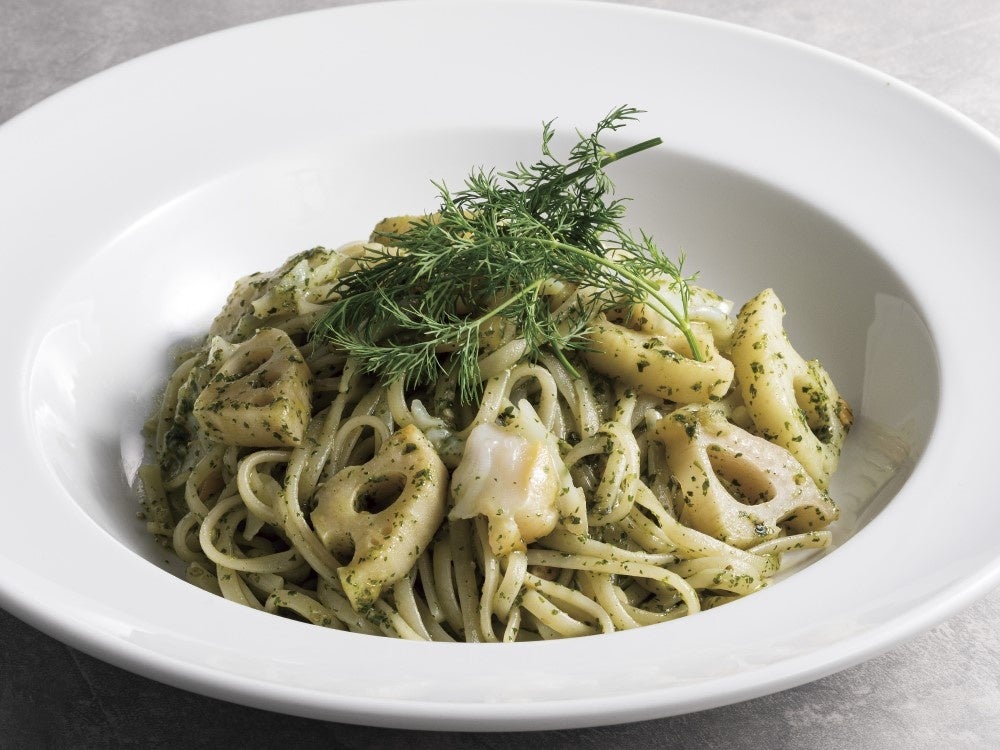■つぶ貝と蓮根のジェノベーゼ リングイネ 1200円(税込1,320円)