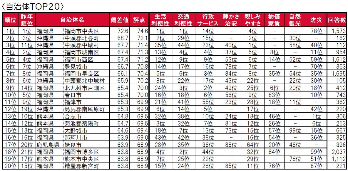 昨年19位だった沖縄県島尻郡南風原町が、大きく順位を上げて今年は12位となっています。また、昨年21位だった福岡県福岡市博多区が18位となり、トップ20入りしています。