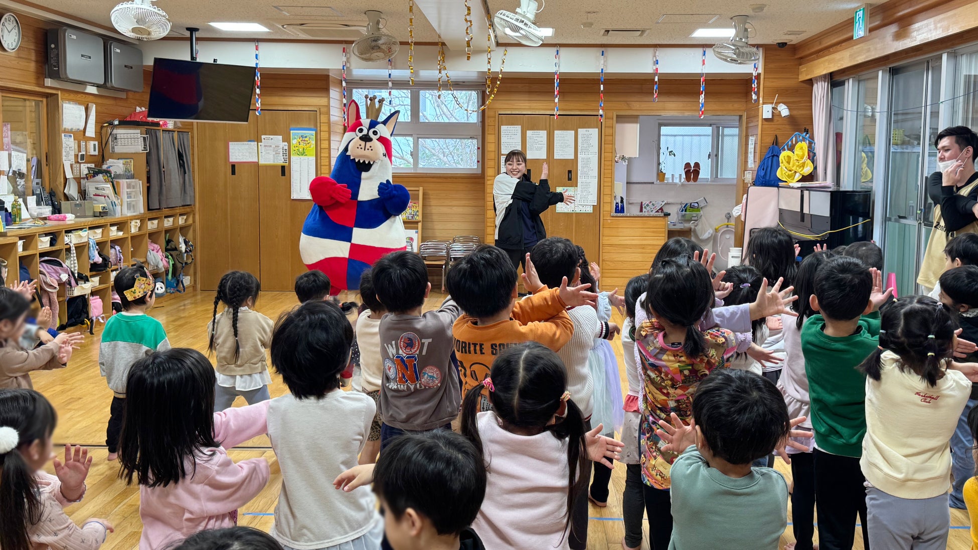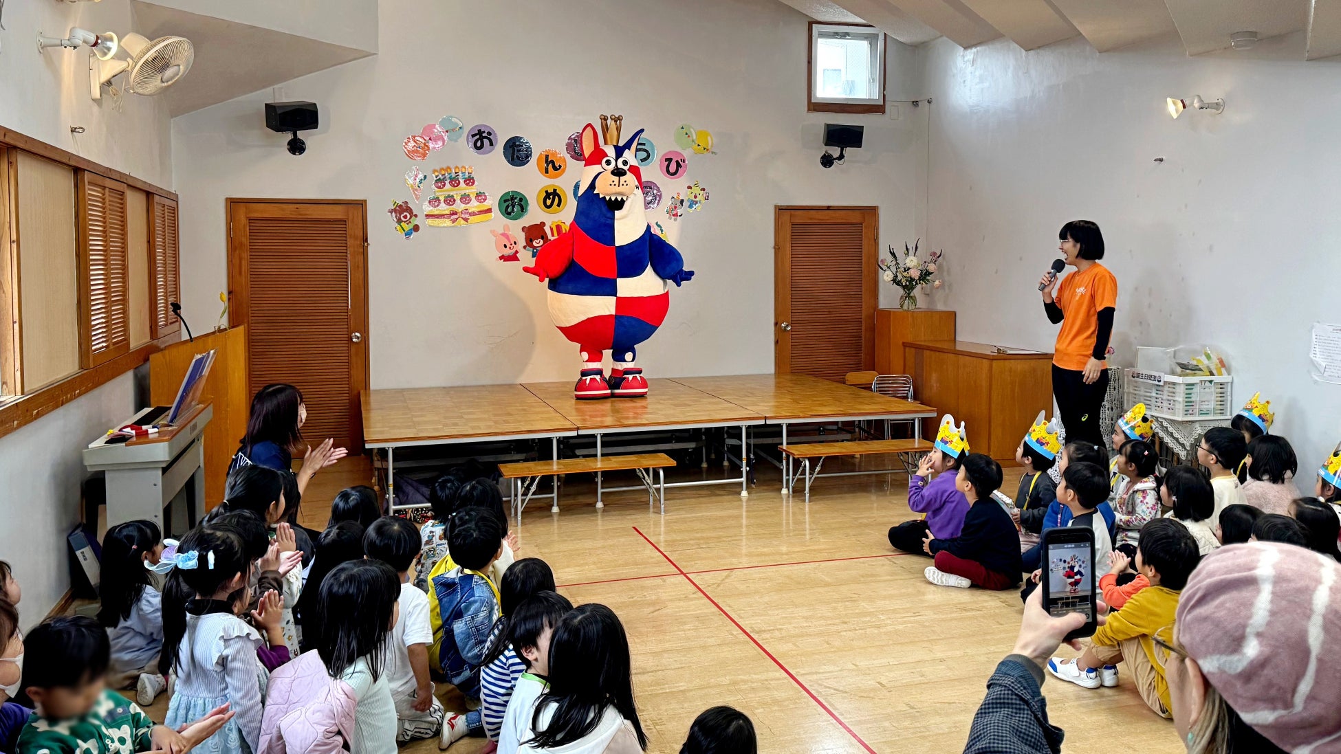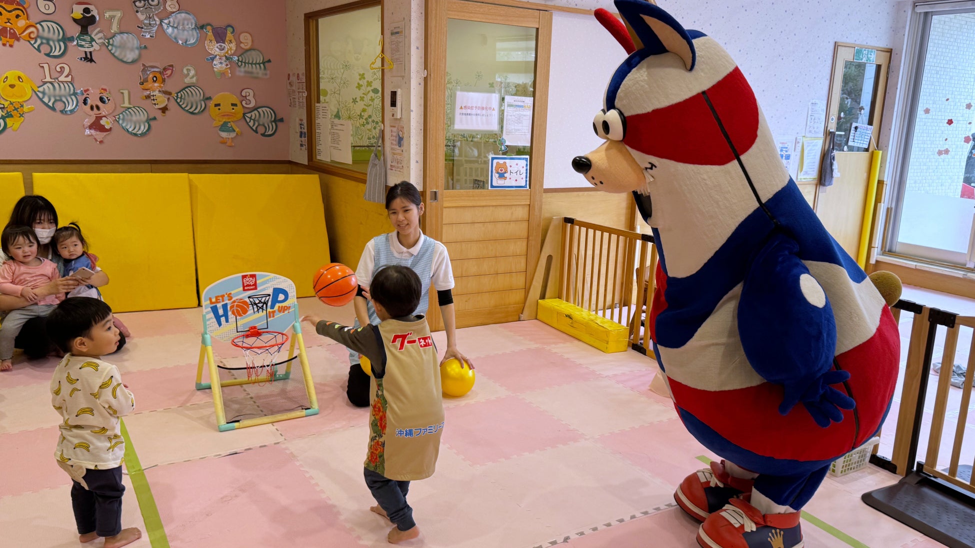 お誕生日会やお楽しみ会では、サプライズゲストとして登場したゴーディーが、子どもたちが披露してくれたダンスに参加しました。さらに、選手入場のBGMに合わせた入場パフォーマンスや、ミニリングへのシュートゲームをお手伝いし、会場全体で盛り上がりました。