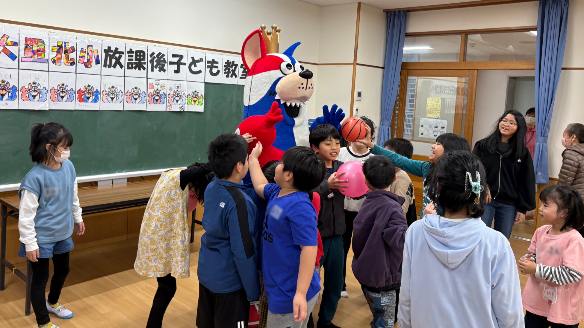 放課後子ども教室では、バスケットボールやキングスに関するクイズ大会、ドリブルリレーを子どもたちと一緒に楽しみました。特に、ゴーディーにタッチすることで勝敗が決まるドリブルリレーでは、夢中になった子どもたちがゴーディーの周りで渋滞するほどの盛り上がりを見せました。