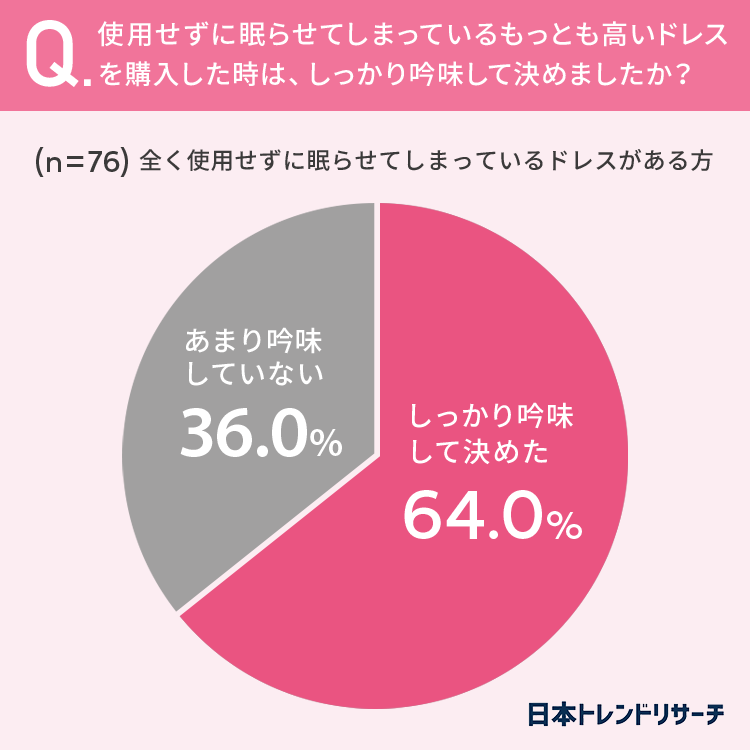 続いて、使用せずに眠らせてしまっているもっとも高いドレスを購入した時は、しっかり吟味して決めたか聞いてみました。