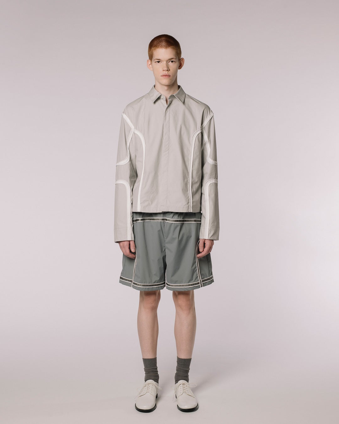 筋繊維や関節に象ったテーピングやパイピングが施されたテクニカルジャケットや、骨格筋の構造を再構築したようなパネル構造のシャツやカットソーなど、スポーツ科学的なコードに基づいた人体を都市的なコードへと読み替えました。