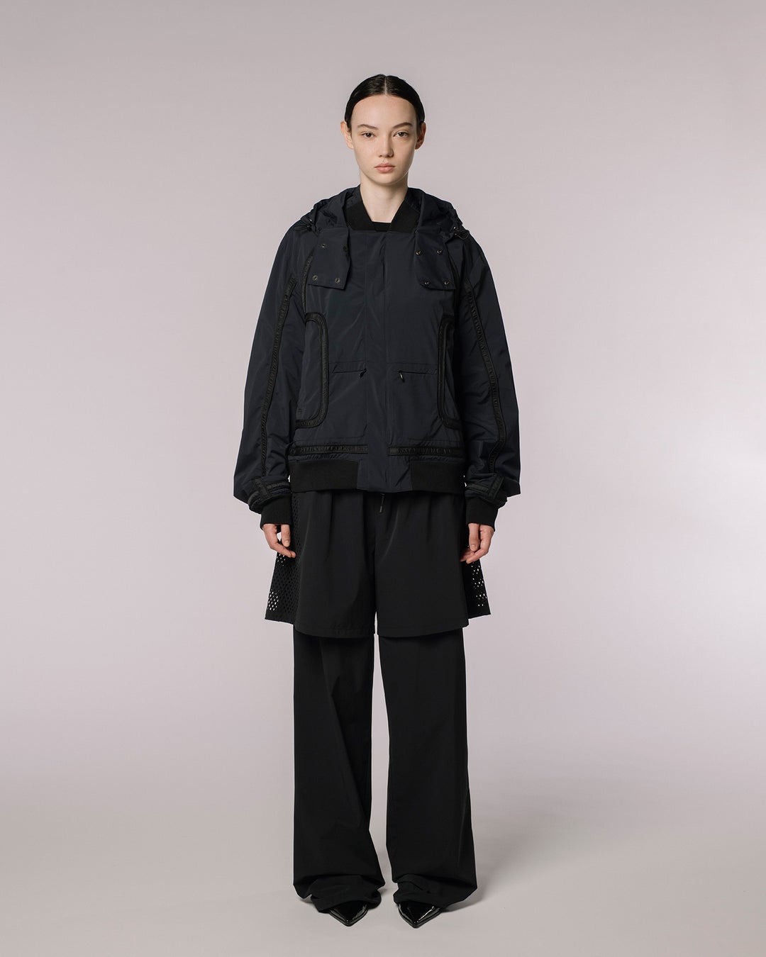 黒やグレー中心のカラー展開に加え、バンブルビー(マルハナバチ)とシェブロンというブランドのアイコニックなモチーフを生地と同系色の刺繍など最小限の表現にとどめたことにより、衣服の構造自体が焦点化されています。