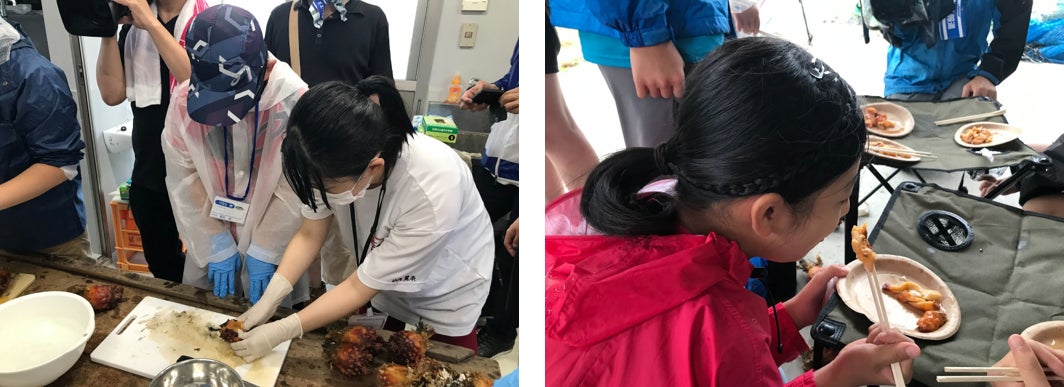 参加19人中16人は食べるのも初めて、ましてや全員が捌くのは初めて、という中での恐る恐るの試食となりました。結果は、みな口々に「初めて食べる味」「美味しい」など、その甘み、塩味、苦味、酸味、うま味の五つの味わいがあると言われる複雑な海の味覚を楽しみながら、海と食とのつながりを再認識していたようでした。
