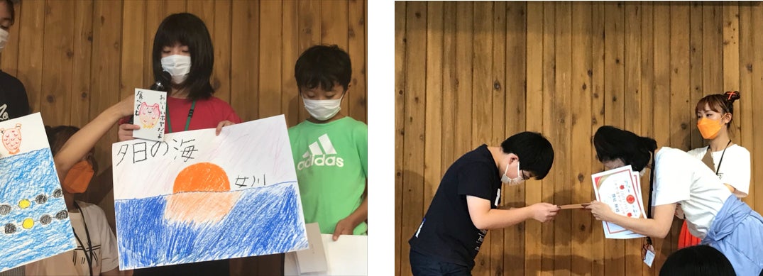 逆に瀬戸内海の特徴や魚についてSTU48のお二人に教えて頂くなど、お互いの住む地域の海について教え合いました。さらに子供達+萌江さんの三陸チーム対STU48沖さん、中村さんによる瀬戸内チームに分かれてそれぞれ三陸に関しての問題、瀬戸内に関する問題を出し合うクイズ大会を実施。結果は子供たちの勝利で終わり前日の学習の成果を存分に発揮した格好となりました。