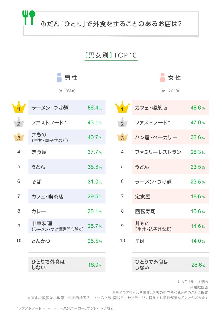 男女別では、ランキングに大きな違いがみられます。 男性では「ラーメン・つけ麺」が5割台半ばの高い割合で1位でした。20代以上の男性では5~6割台となり、過半数がひとりで「ラーメン・つけ麺」屋を利用していることがわかりました。「丼もの(牛丼・親子丼など)」「定食屋」なども上位に入っています。