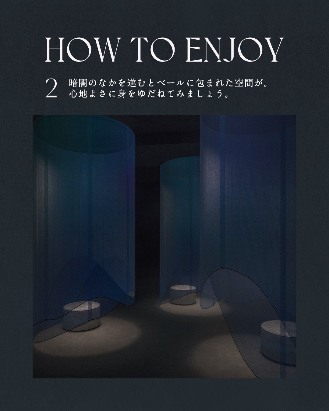 暗闇の中のルージュ店は、ルージュの塗り心地を味わうコスメ店。感覚を研ぎ澄まし、やわらかなベールに包まれた薄暗く静かな空間の中で、心地よさに身をゆだね、唇がとりこになるような至福の塗り心地を体験いただけます。