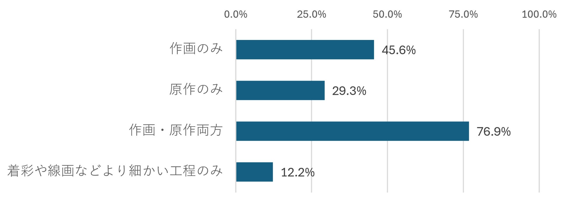 近年のマンガの制作体制では、1人で執筆する体制だけでなく、原作担当と作画担当で分業する体制や、Webtoon作品向けに着彩担当や線画担当など、さらに細分化している体制も増えてきました。このような分業制に対し、挑戦したい作業担当のアンケートを実施した結果、マンガ制作作業が細分化するほど、挑戦のハードルが高いと感じている傾向が伺えました。