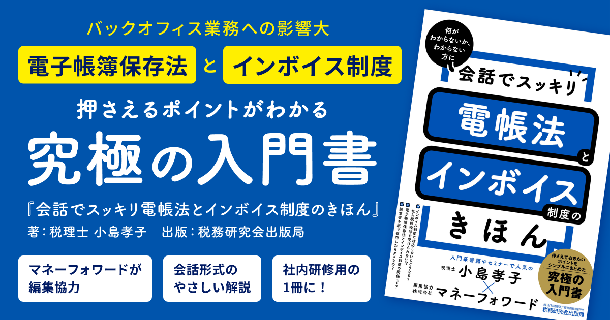 本書は2022年10月31日に発売された、「電子帳簿保存法」「インボイス制度」についてシンプルにまとめ、会話形式で解説した入門書です。各法制度の解説に留まらず、今後の経理のデジタル化の動向や、施行される法制度を活用したデジタル化に向けた提案などを、登場人物たちの会話を通じて楽しく学べる一冊です。第4章のQ&Aでは本セミナーにも登壇するマネーフォワード執行役員の松岡俊、野永裕希との対談を収録しています。