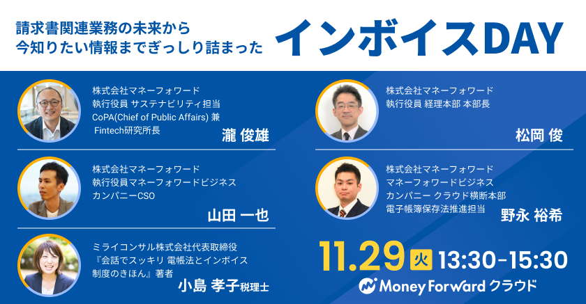 そのほか、請求書関連業務に関する今後の変化について、デジタルインボイス推進協議会のメンバーで、当社執行役員の瀧よりお話しします。また、当社ビジネスカンパニーCSOの山田より、マネーフォワードがインボイス制度に対する取り組みをご紹介いたします。