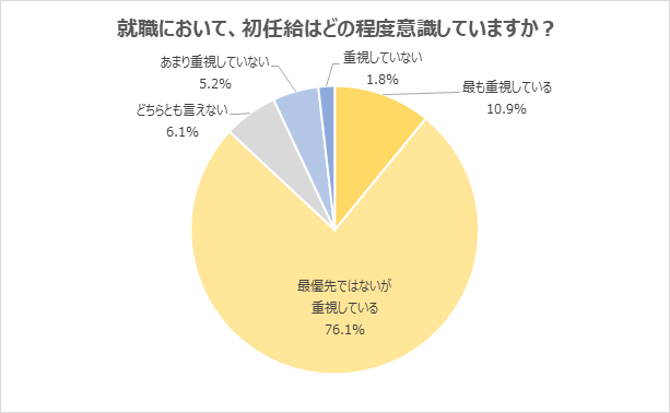 株式会社学情(本社:東京都千代田区)は、2024年3月卒業(修了)予定の大学生・大学院生を対象に、インターネットアンケートを実施。今回は、「初任給」に関して調査しました。初任給を「最優先ではないが、重視する」と回答した学生が76.1%に上りました。「最も重視している」10.9%を合わせると、約9割の学生が初任給を重視していることが分かります。「物価高が続いているので、初任給でいくらもらえるかは重視したい」「奨学金を返済しなければいけないので、生活できるかは重視している」などの声が寄せられました。また、初任給の高い企業について、「志望度が上がる」「やや志望度が上がる」と回答した学生が83.7%に上りました。「初任給が高い企業は、若手のうちから活躍のチャンスがあると思う」「他の条件が同じなら、給与が高い企業のほうが志望したいと思う」といった声が上がっており、初任給の高い企業に好感を持つ学生が多いことが分かります。