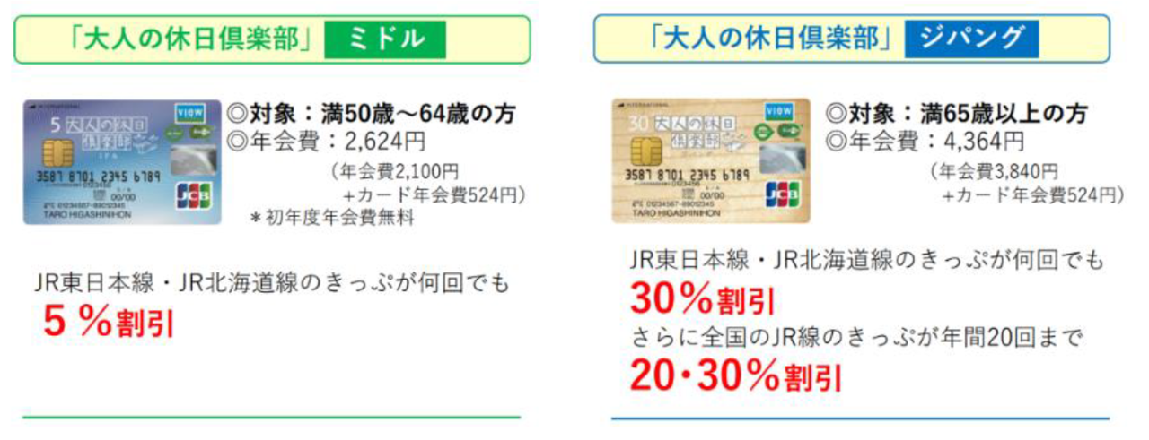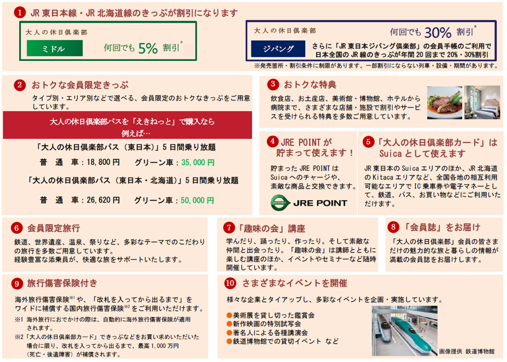 東日本エリアを中心に、満50歳以上の「大人の休日倶楽部ミドル」と、満65歳以上の「大人の休日倶楽部ジパング」があり、各々のニーズに合わせた旅行商品・特典や、講座・サークル活動を通じて会員同士の仲間づくりを支援しています。