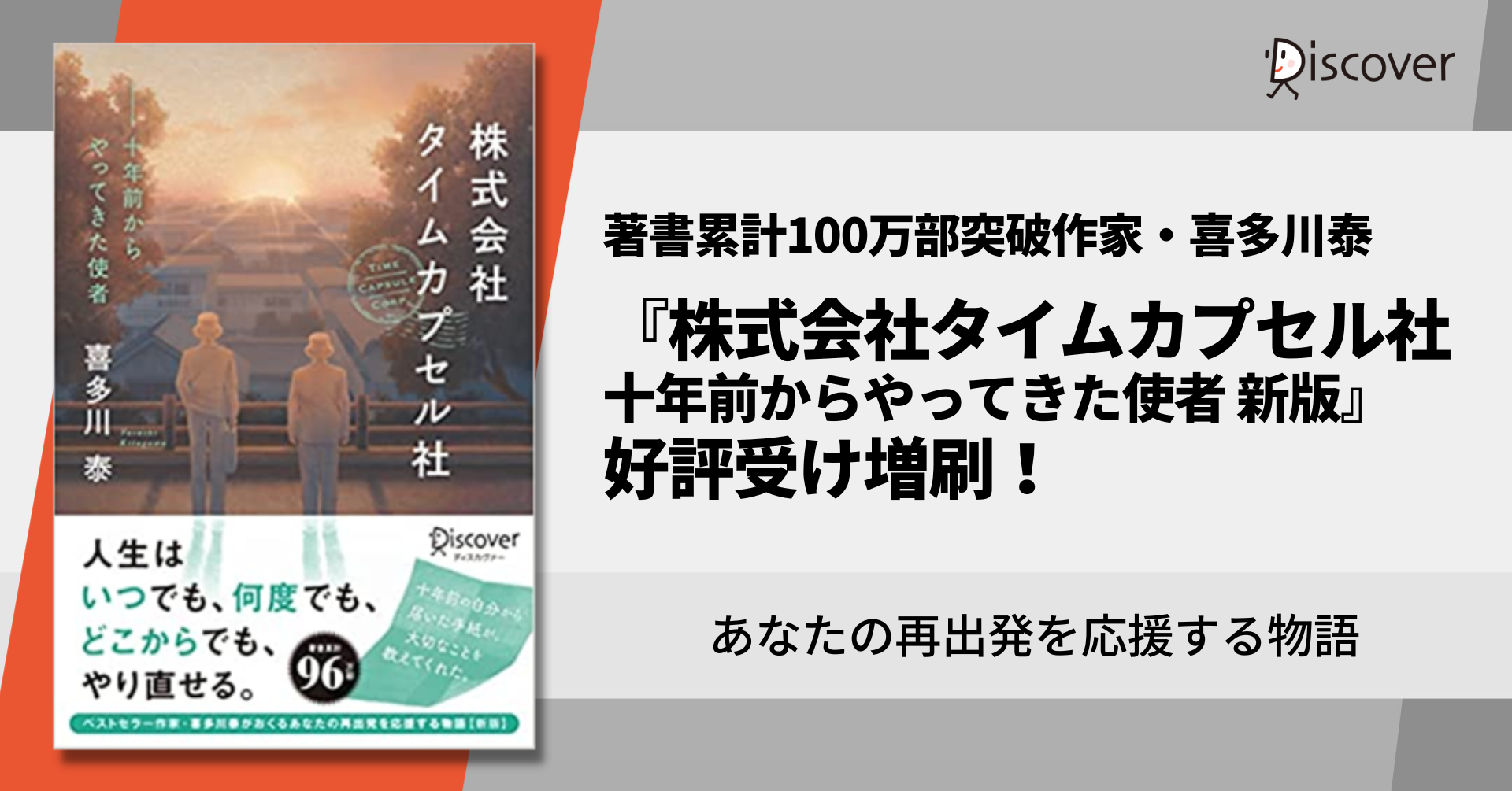 株式会社ディスカヴァー・トゥエンティワン(本社:東京都千代田区、取締役社長:谷口奈緒美)は2022年4月25日刊行の『株式会社タイムカプセル社 十年前からやってきた使者 新版』(喜多川泰・著)を増刷しました。