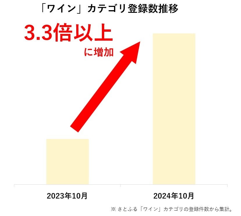 2024年10月の「ワイン」カテゴリお礼品の登録件数は、前年同月比で3.3倍以上に増加しました。その中でも、オレンジワインやロゼワインの登録件数が増えており、特にオレンジワインの1月から10月の登録件数は、前年同期比で5.6倍以上に増加しました。お礼品として選べるワインの選択肢が増え、ふるさと納税ではさまざまな種類のワインを楽しめるようになっています。