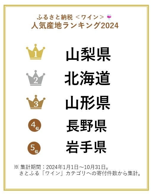 2024年1月から10月までの「ワイン」カテゴリお礼品への寄付件数をもとにした人気産地ランキングでは、都道府県別の日本ワイン製成数量ランキング(※)と同じく山梨県が1位でした。さらに、2位の北海道、3位の山形県も、日本ワイン製成数量ランキングTOP5に入るワイン造りが盛んな地域であることから、ふるさと納税においても選ばれていると推察されます。