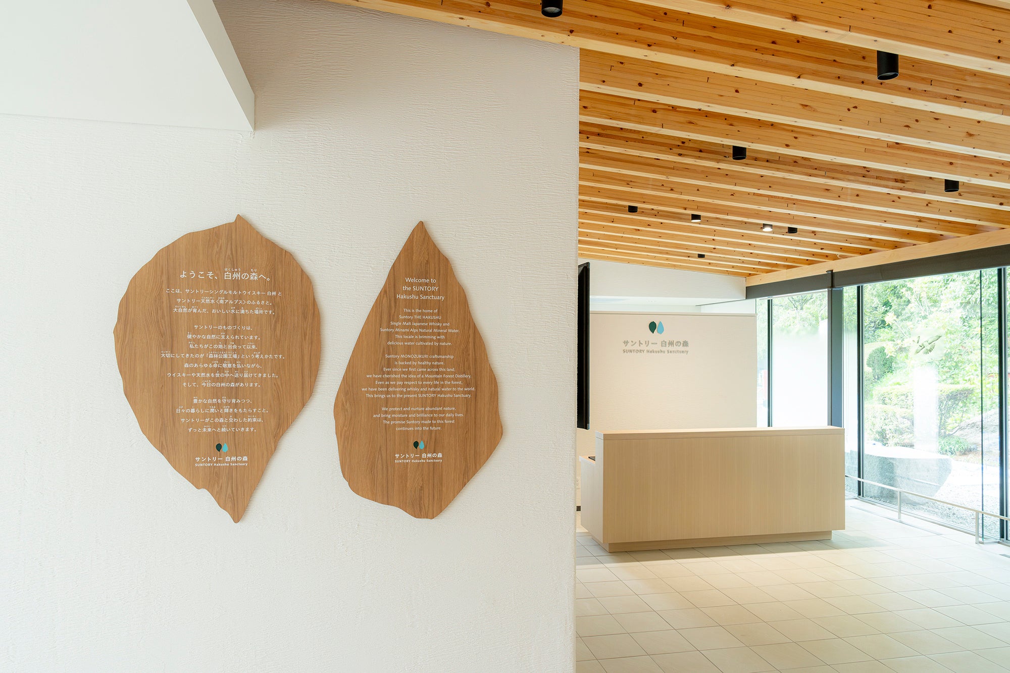 白州蒸溜所とサントリー天然水 南アルプス白州工場の両工場共通の玄関として、二つの施設とその敷地全体を包み込む“白州の森”の魅力を知っていただけるような施設を目指しました。建築資材やデザインには、花崗岩・森・水という、白州の自然環境を語る上で欠かせない要素を随所に取り入れています。場内見学や見学ツアーの受付を設けるほか、新たにジオラマを設置し、敷地全体を視覚的に理解していただける空間や、両工場のオリジナルグッズを購入いただける「ビジターセンターGift Shop」も併設します。